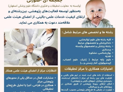 به اطلاع میرساند ، مرکز تحقیقات" ناهنجاریهای جمجمه ای – صورتی " ( وابسته به معاونت تحقیقات و فناوری دانشگاه علوم پزشکی اصفهان ) به منظور توسعه فعالیت های پژوهشی بین رشته ای و ارتقای کیفیت خدمات "علمی- بالینی "از اعضای هیئت علمی علاقه مند در حیطه های مرتبط دعوت به همکاری مینماید ،از علاقه مندان دعوت میشود : نام ، نام خانوادگی ، رشته تحصیلی و آخرین مدرک تحصیلی خود را به شماره همراه 09103493244 پیامک کنید.